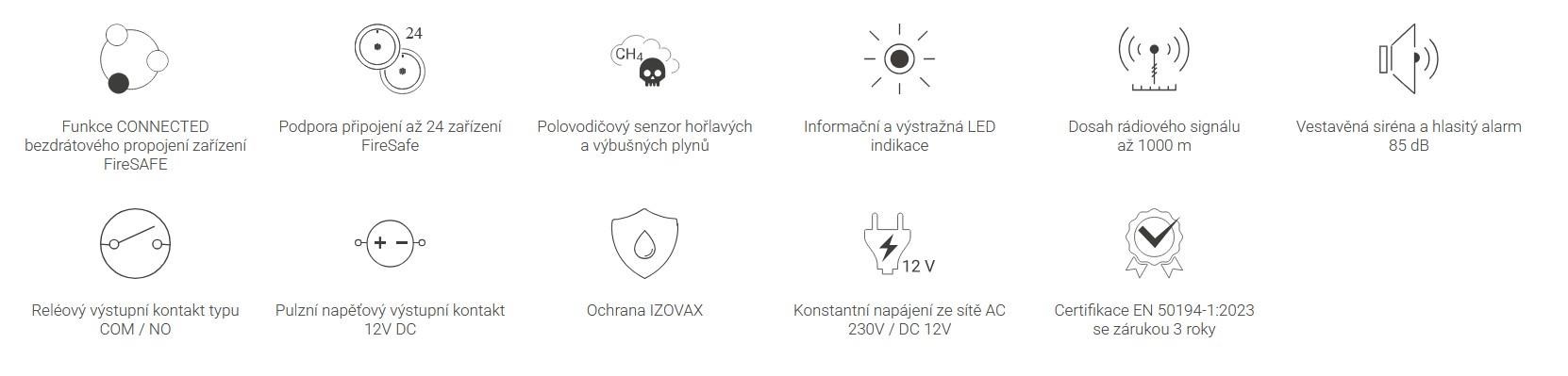 Bezdrátový detektor metanu (CH4) a zemního plynu: bezdrátový, 868 MHz (dosah 1000 m), siréna 85 dB, IPX2D. Relé a pulzní výstup pro ovládání ventilů/ventilace. Pracuje autonomně nebo v systému FireSAFE. Barva bílá.