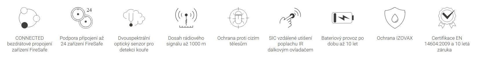 Nová generace bezdrátového detektoru požáru s přelomovou detekcí dvouspektrální prachu odolné optické komory a technologií SIC pro dočasně utišení poplachu pomocí IR dálkového ovladače, který může pracovat jako součást požárního zabezpečovacího systému FireSafe s podporou centrální ovládací jednotky FireSafe SAFE 50HUB-WRF nebo zcela autonomně. Napájení zajišťuje integrovaná lithiová baterie (zabudovaná, neměnitelná) garantující mimořádně dlouhý provoz zařízení po více než 10 let a prodlouženou 10letou zárukou jak na baterii, tak i na samotné zařízení.