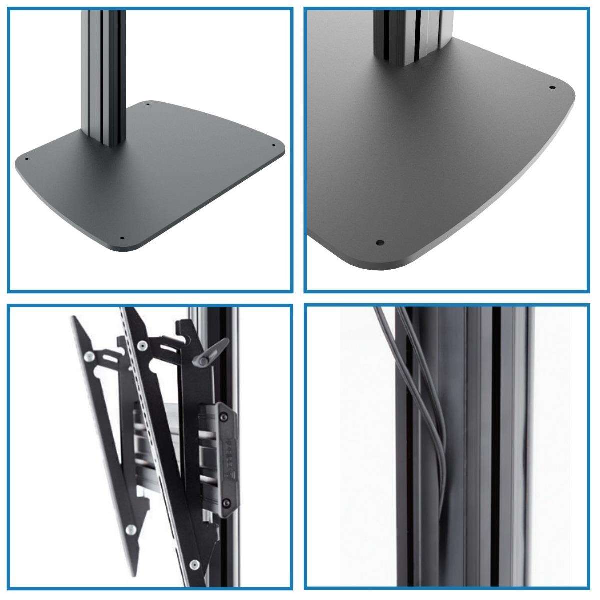 Profesionální designový stojan pro zavěšení televizorů, monitorů a dotykových obrazovek s úhlopříčkou 40" až 75". Stojan je vyroben z hliníku, podstava je z litiny o rozměrech 590x435x10mm. Podstavu je nutné ukotvit do podlahy nebo připraveného podstavce - není samostojný. Obrazovky je na stojanu možné nastavit do potřebné výšky od 250mm až do 1770mm (vzdálenost od podlahy po střed obrazovky) a nastavit náklon od 0° až do -11°. Stojan je možné zakoupit včetně poličky na příslušenství a poličky na kameru. Stojan podporuje VESA standardy 75x75 až 600x400 a má nosnost 80kg. Materiál hliník a litina. Poličky jsou kovové. Instalační materiál. Záruka 5 let.
