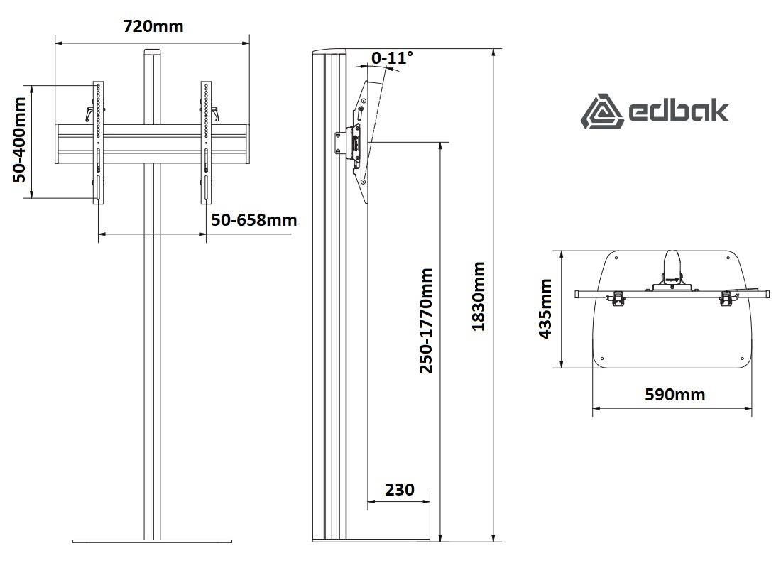 Profesionální Tv stojan Edbak STDV100Stojan na Tv a monitory 40-75", nastavitelná výška obrazovky 250-1770mm, náklon 0°/-11°, vedení kabeláže, VESA 75x75 až 600x400, nosnost 80kg,