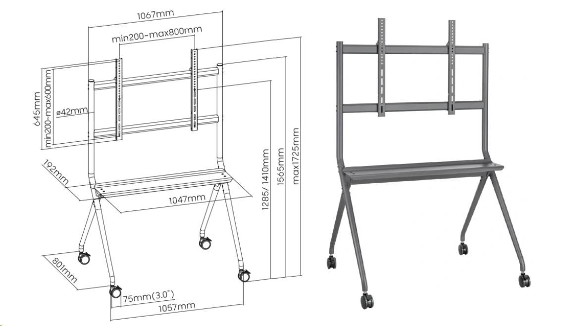 iber Mounts M9C77: Stojan na Tv 50" - 90", nastavení výšky středu Tv od podlahy 1285-1410 mm, polička 1047x192 mm, kolečka 75 mm s aretací, VESA standardy 200x100 až 800x600, nosnost 100 kgPodlahový stojan pro profesionály na jejich prezentace a přednášky, vhodný taktéž do učebny pro zobrazovací zařízení nebo dotykové obrazovky. Ideální pro zavěšení televizoru, monitoru nebo displeje s úhlopříčkou 50" až 90". Stojan Fiber Mounts M9C77podporuje VESA standardy 200x100 až 800x600 a bezpečně unese zařízení s hmotností až 100 kg. Minimální potřebný prostor na podlaze pro umístění stojanu je 1100x850 mm. Výšku obrazovky je možné nastavit od 1285 mm do 1410 mm (od podlahy po střed obrazovky). Stojan je osazen poličkou s rozměry 1047x192 mm. Barevné provedení černé. Záruka 3 roky.