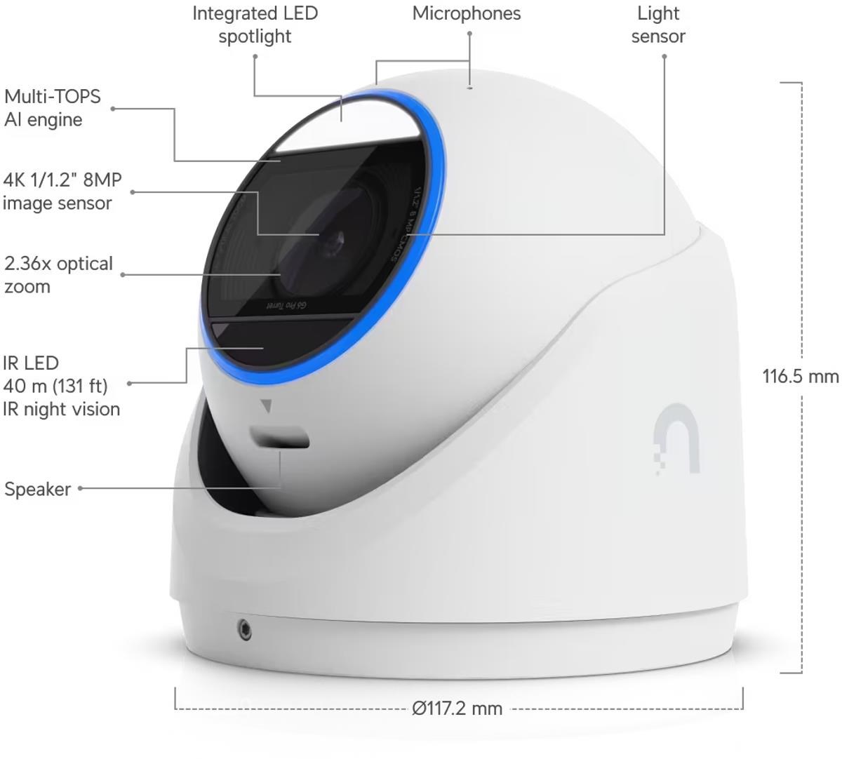 Popis produktuUbiquiti UniFi IP turret hybrid kamera UVC-G6-Pro-Turret-W disponuje 8MP snímačem (3840 x 2160 px) při 30fps, variofokálním objektivem (5,85mm-13,8mm), kombinovaným IR/bílé světlo přísvitem pro noční vidění na vzdálenost až 40m, krytím IP66 a IK4 a vestavěnými mikrofony. Do sítě lze kameru připojit pomocí 1Gbit LAN s podporou napájení přes PoE+ s maximální spotřebou 15W.