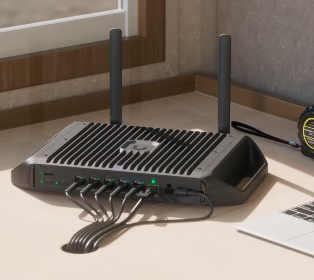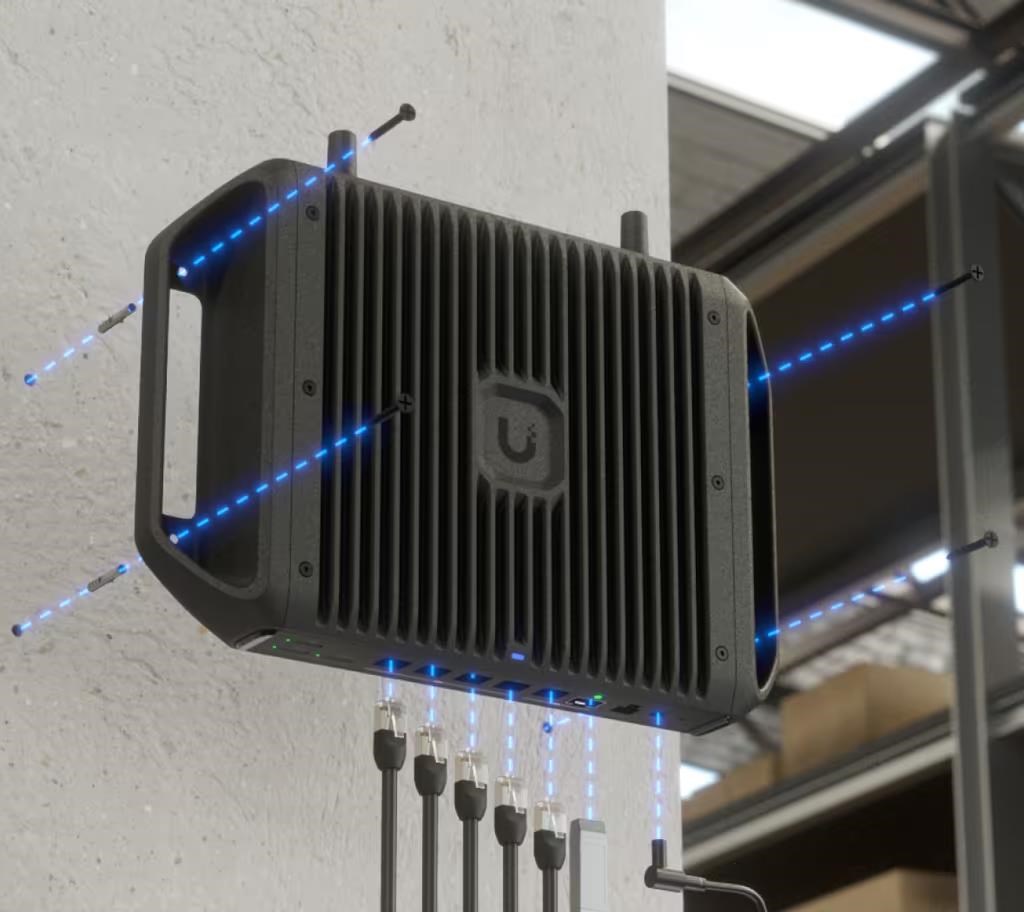 Ruggedized, fanless 10 GbE UniFi Cloud Gateway delivering 350W of total system power for high-density PoE deployments, with advanced routing capabilities and microSD storage for full UniFi application support.