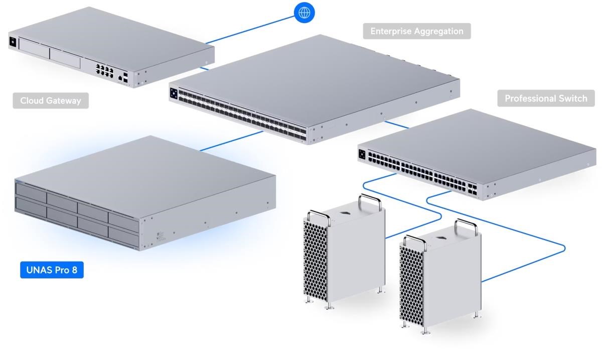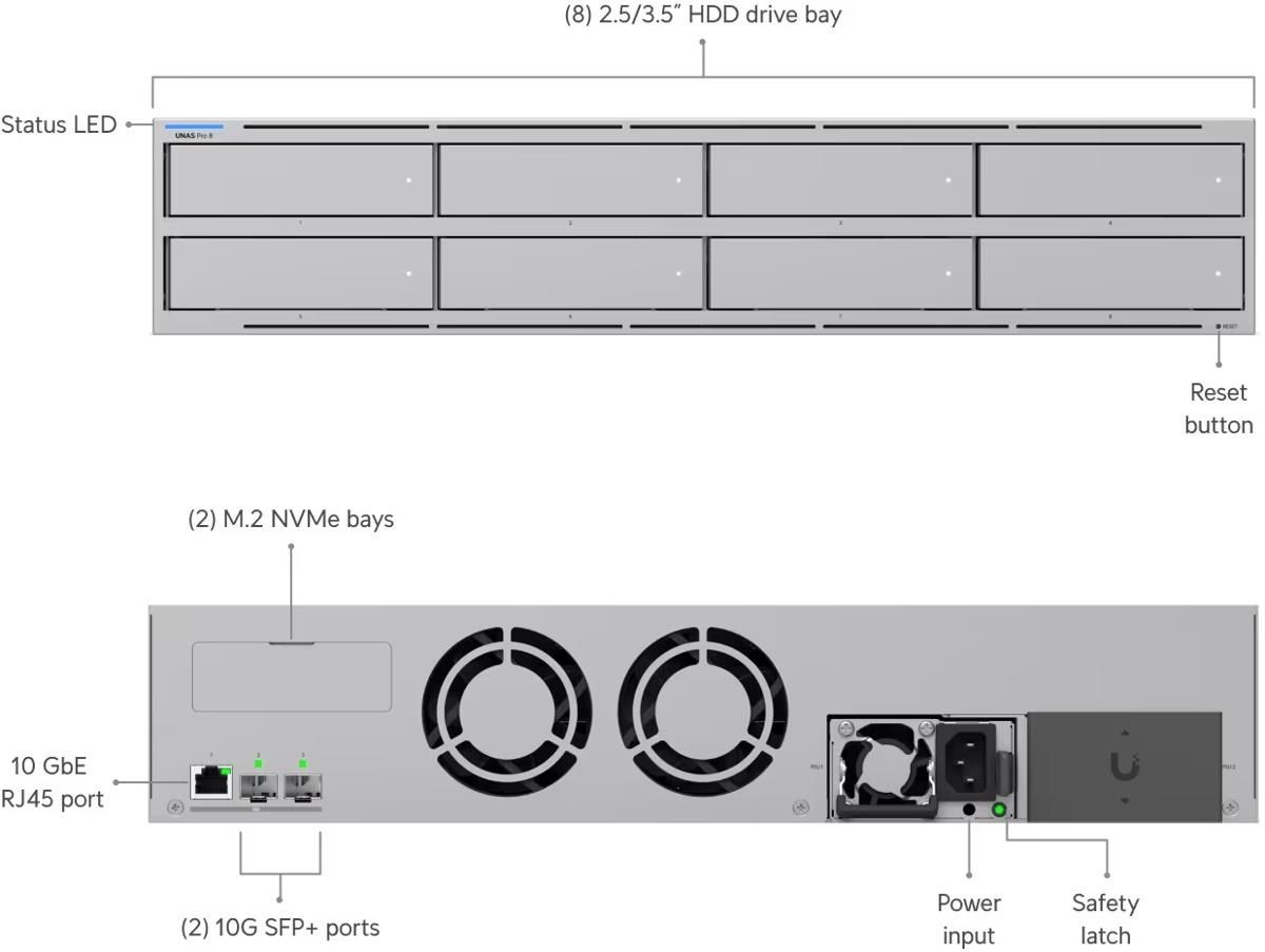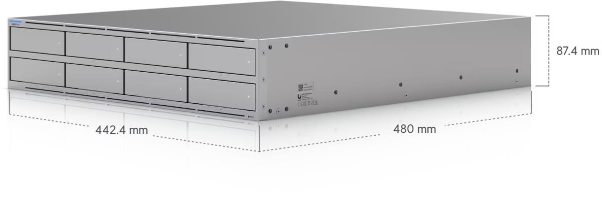 Popis produktuSíťové úložiště UniFi velikosti 2U pro montáž do racku s (8) pozicemi pro 2,5/3,5" pevné disky, (2) sloty pro M.2 NVMe SSD cache, (1) 10 GbE RJ-45 portem a (2) 10G SFP+ porty pro uplink. Poháněn je čtyřjádrovým procesorem ARM Cortex-A57, který je doplněný o 16 GB operační paměti. Disponuje dvěmi redundantními napájecími moduly s možností výměny za provozu.