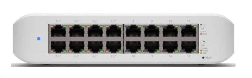 USW-Lite-16-PoE je Gigabitový PoE L2 Switch od Ubiquiti Networks v desktop provedení s maximálním PoE budgetem 45W. Managovatelný switch s 16 Gigabit metalickými porty a celkovou propustnost 16 Gbps. Pouze 8 portů z 16ti podporuje PoE napájení 802.3af/at s maximálním výkonem 30W/port. Switch je díky nízkému PoE budgetu vhodný spíše jako datový s napájením pár zařízení na okraji sítě