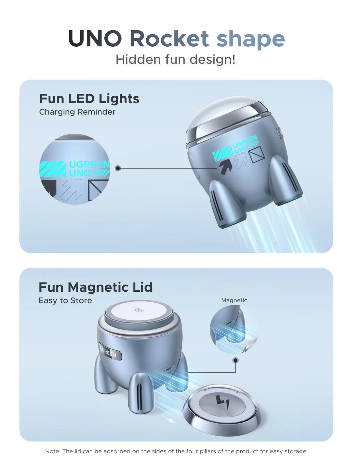 UGREEN magnetická bezdrátová nabíječka 2v1 MagFlow Qi2.2, 25W, MagSafe, raketa