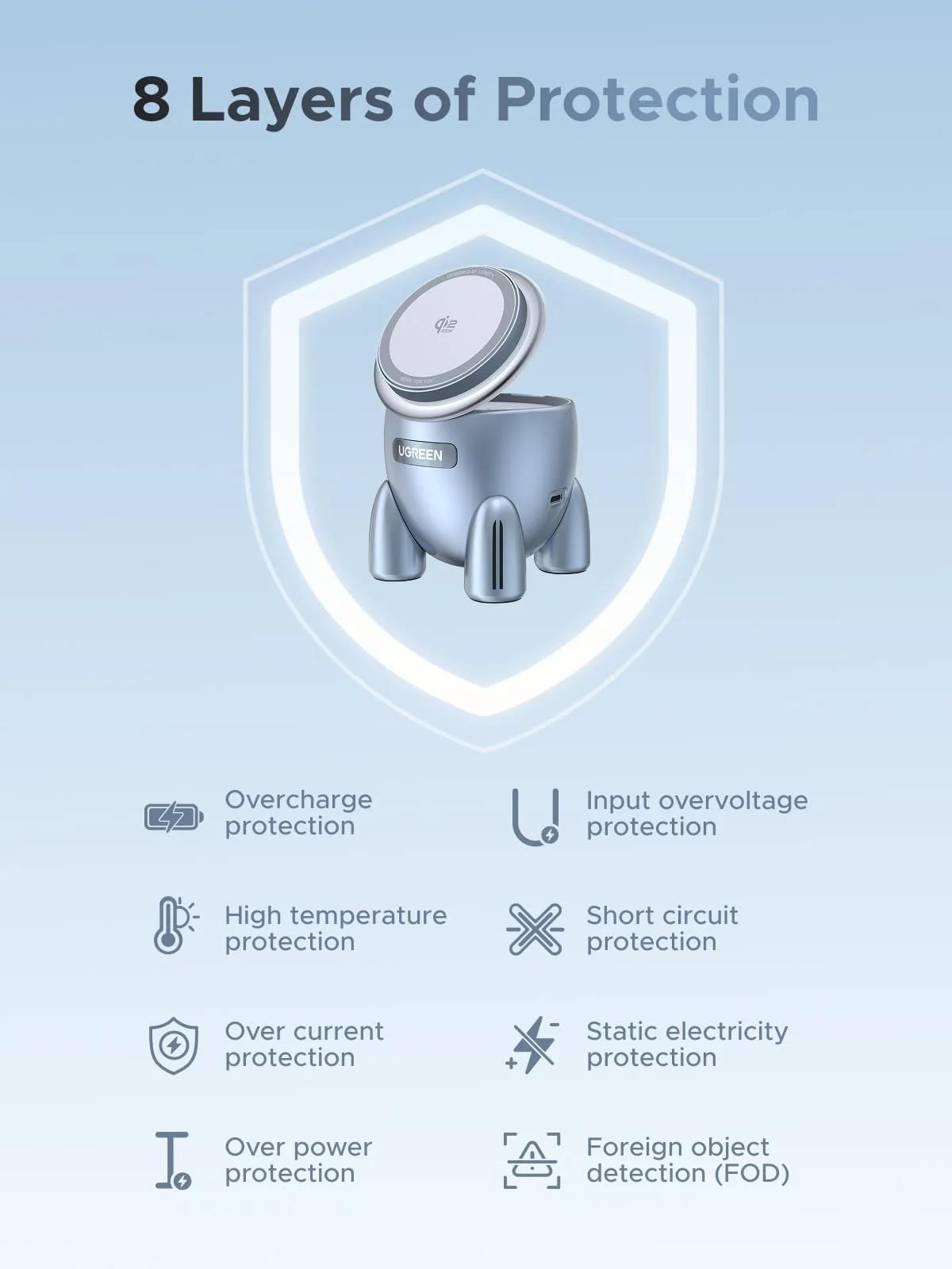 - Bezpečné a spolehlivé nabíjení: Ochrana proti přepětí, nadproudu, přehřátí, zkratu a detekce cizích předmětů (FOD) zajišťují bezpečný provoz