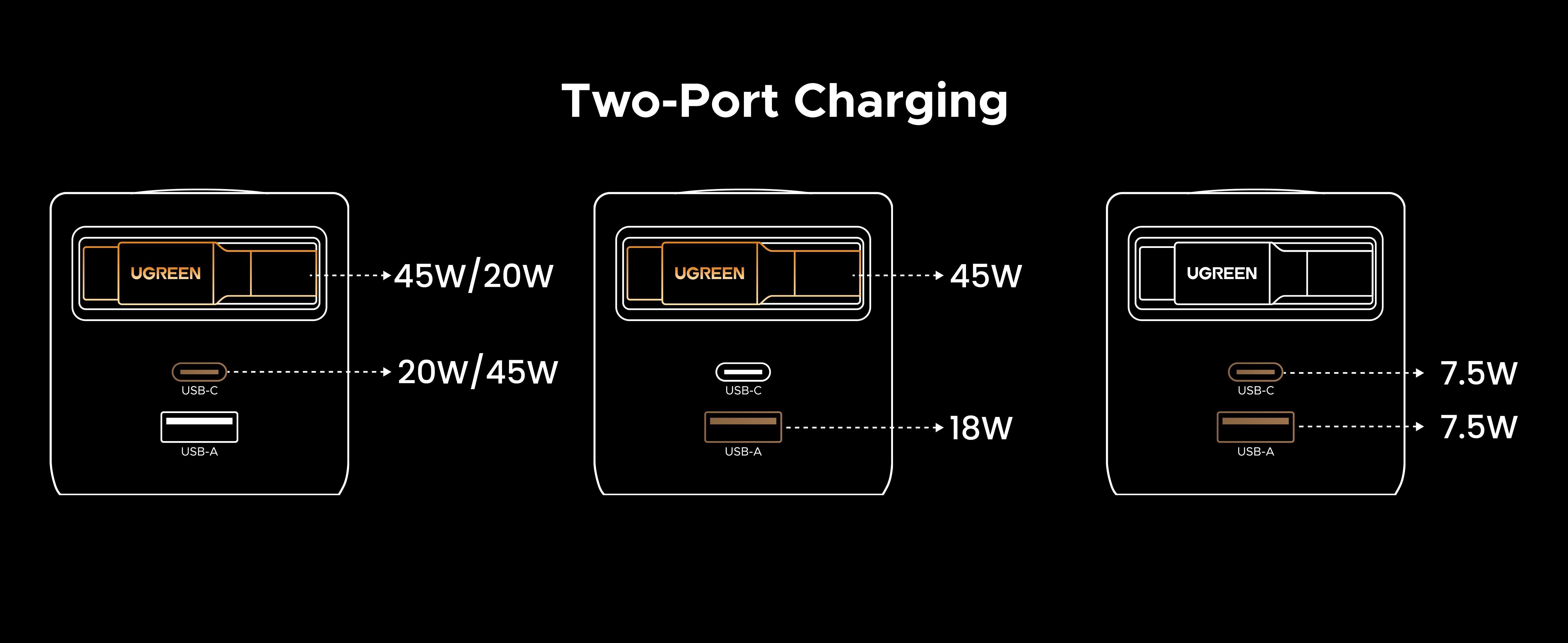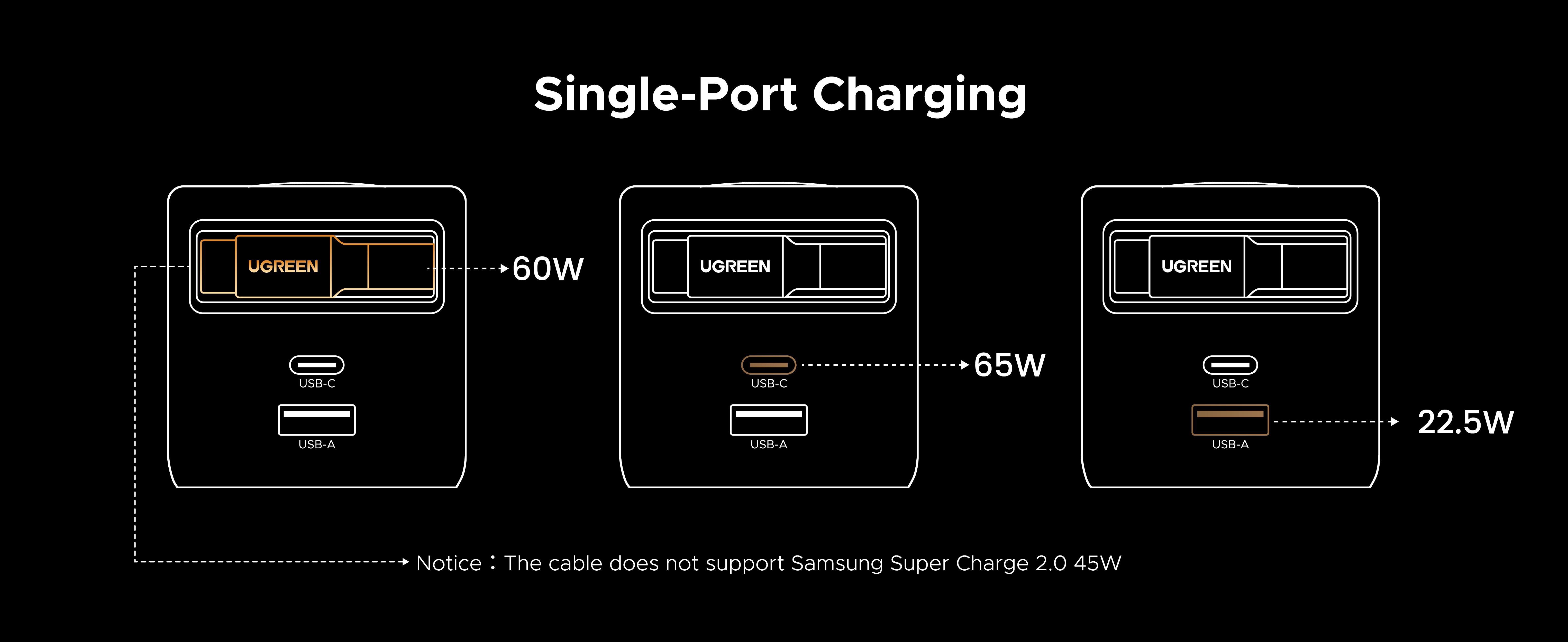 | Output | 65W Max USB-C1 kabel: 5.0V=3.0A/9.0V=3.0A/12.0V=3.0A/15.0V=3.0A/20.OV=3.0A 60.0W Max USB-C2: 5.0V=3.0A/9.0V=3.0A/12.0V=3.0A/15.0V=3.0A/20.OV=3.25A 65.0W Max USB-A: 5.0V=3.0A/9.0V=2.0A/12.0V=1.5A/10V=2.25A 22.5W Max |
