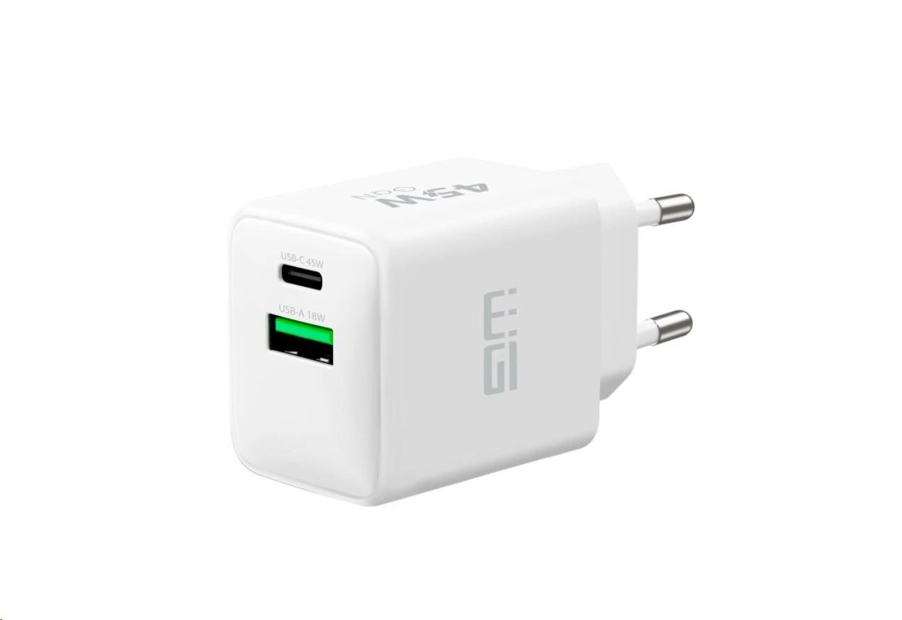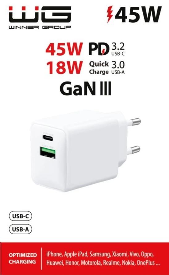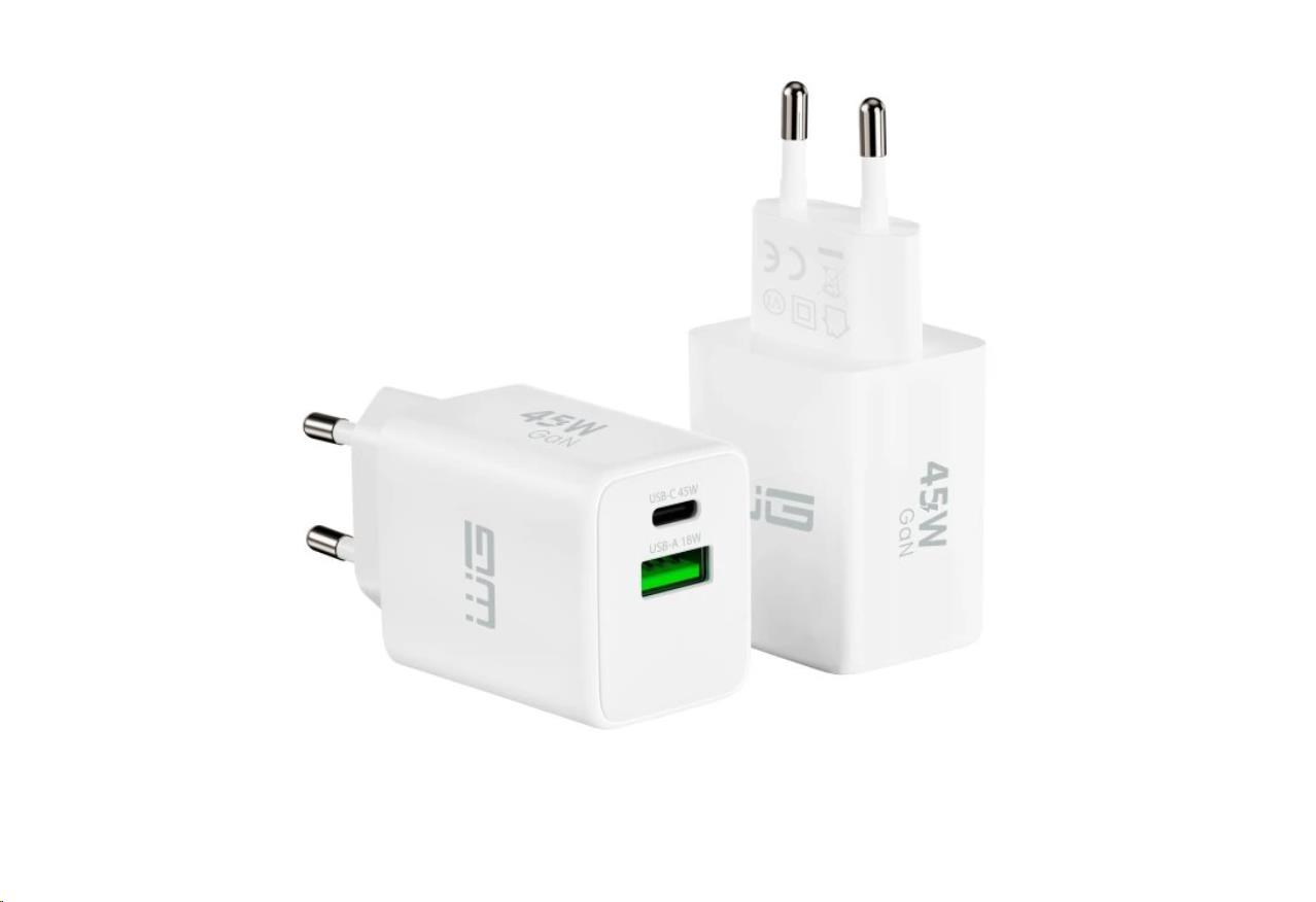 WG Síťová nabíječka GaN 2xUSB (A+C)/USB-C PD45W+USB-A QC3.0 18W/white