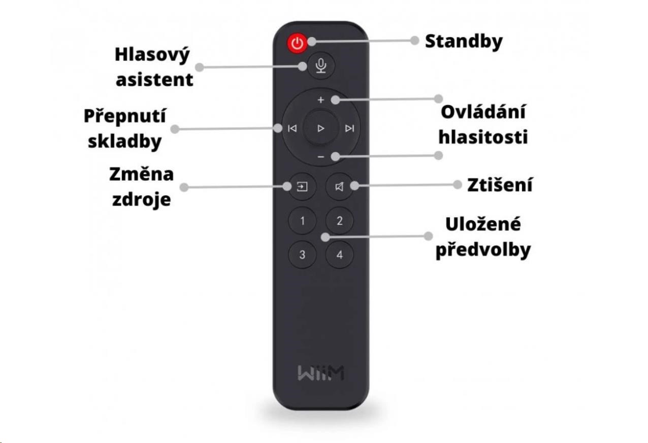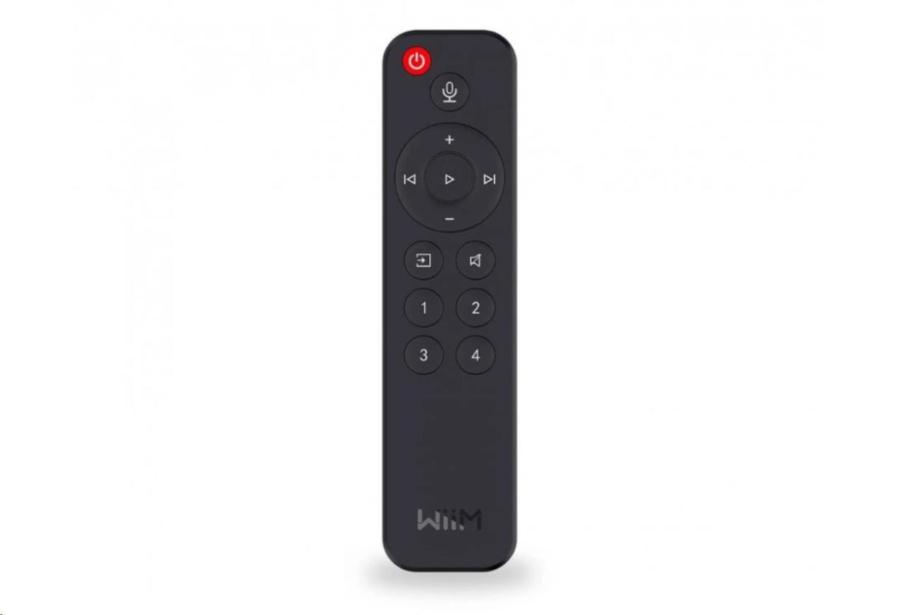 Dálkový ovladač pro Hi-Res audio streamery WiiM. Podpora funkcí: zap/vyp, ovládání hlasitosti, play /stop, posunutí skladby, přepnutí vstupu, mute, hlasový asistent, předvolby 1-4.